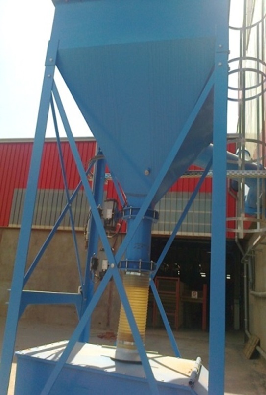 L’air poussiéreux entre le caisson a filtres, du dépoussiéreur dans une chambre de détente, ce qui correspond à une première filtration. Les particules les plus lourdes tombent et sont stockées dans des bidons tandis que les plus fines sont filtrées par des manches ou des cartouches située en haut du dépoussiéreur. Ensuite, l’air propre est évacué du filtre par une ouverture au-dessus de l’appareil.